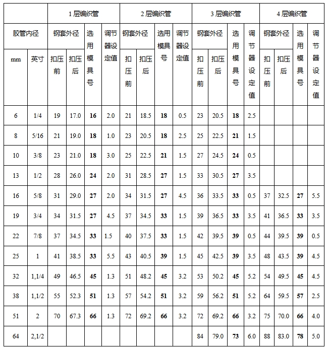 ◆例:25mm(一英寸)口径4层缠绕胶管总成扣压,预期的扣压后钢套直径为43.5mm,应选用38号模具(扣压范围38.0mm至44.0mm)。调节器设定值为5.5mm(43.5mm-38.0mm=5.5mm)。
